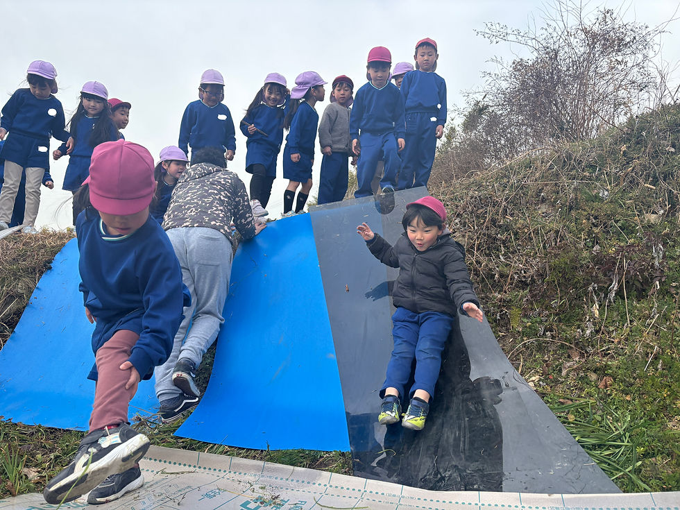 「こっちの方が面白いんちゃう?」そんな子どもたちの一言から、場所や角度を工夫し、よりスピードが出て長く滑れる滑り台へと進化していきました。