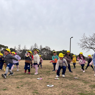 そこでは自分たちで作ったフリスビーを「えいっ!」と投げて遊んだり、ふわふわの芝生の上を思いきり走り回ったりと、思い思いに体を動かして楽しみました。